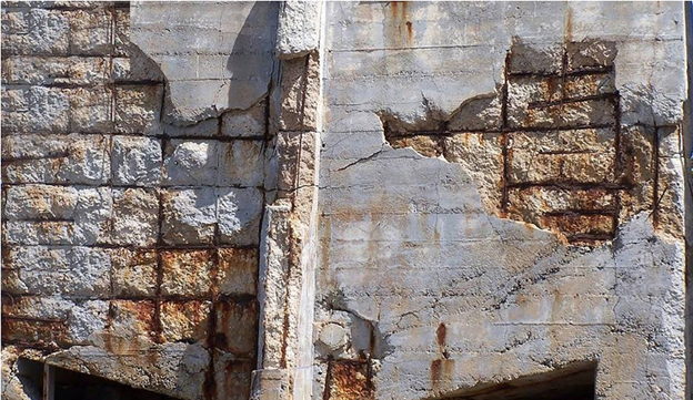 >>>>>>>>>>>>>>>>>>>>>>>>>>>>>>>>>>>>>>>>>>>>>>>>>>>>>>>>>>>>>>>>>>>>>>>>>>>>>>>>>>سنلاحظ في هذه الصور شروخ تظهر بسبب صدأ حديد التسليح كلها تتبع قاعدة واحدة في الحدوث وهي شروخ على نفس شكل التسليح نفسه وهذا يسهل اكتشاف نوع الشرخ بسهولة جدا كما هو واضح في الصورة .